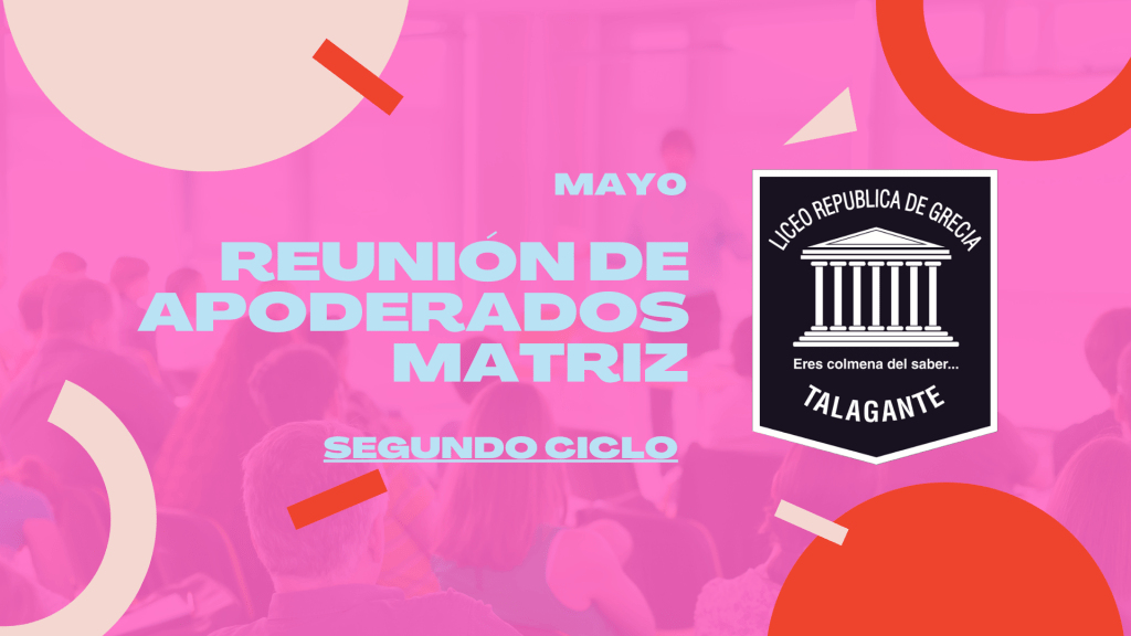 ¡Atención apoderados del segundo ciclo de enseñanza! (De quinto a octavo básico) Se cita a reunión de apoderados para este jueves 25 de mayo a las 18:00hrs. En sede casa matriz: Balmaceda 1133, Talagante.