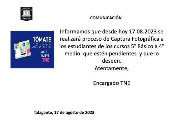 Informamos sobre el proceso de captura fotográfica TNE para los estudiantes que estén pendiente con su pase escolar o para quienes lo deseen. Esto se realizará en ambas sedes según corresponda.