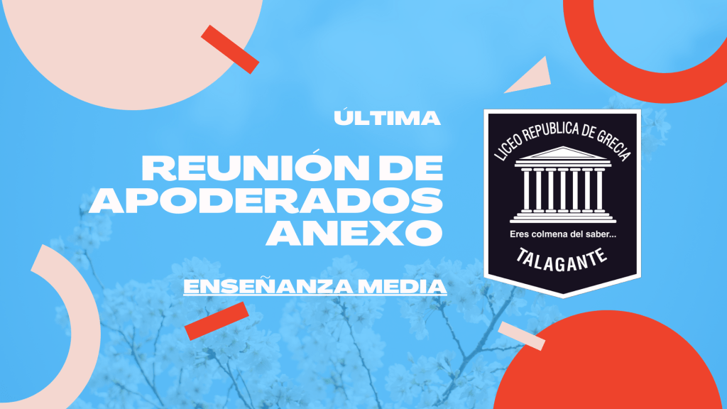 Junto con saludar, se cita a la última reunión de apoderados de nuestra sede anexo para el día miércoles 08 de noviembre a las 18:00hrs. de primero a cuarto medio.