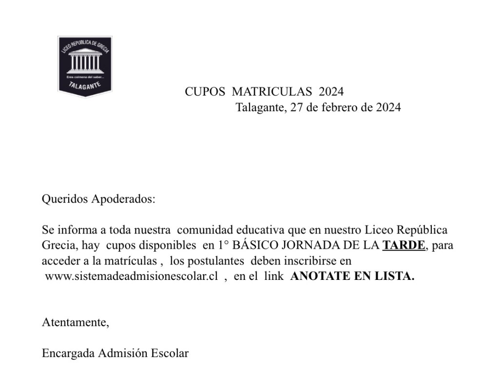 ¡INFORMACIÓN IMPORTANTE! Cupos y matrículas (Casa Matriz)